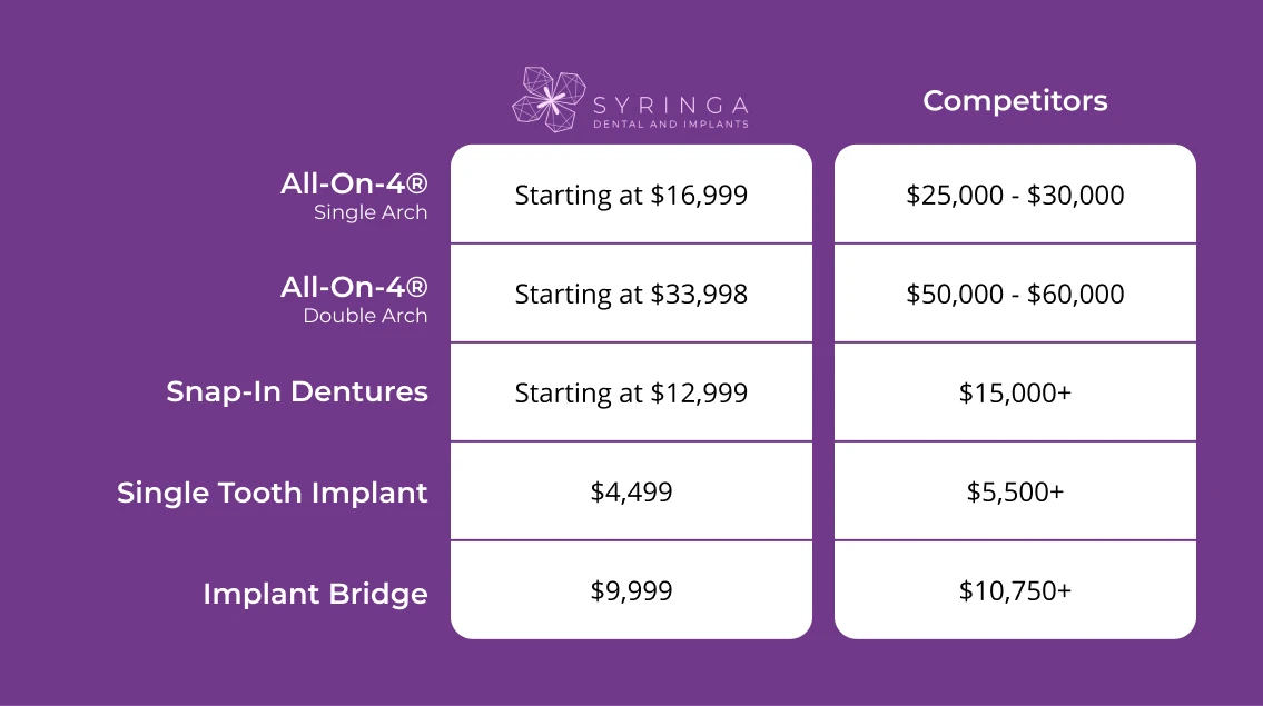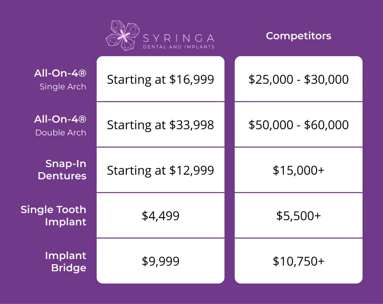 At Syringa Dental & Implants, you can rest assured that you’re getting the absolute best price for your dental implant treatment without sacrificing quality. This is due to our state-of-the-art technology and in-house lab, which allow us to complete your entire procedure and teeth fabrication under one roof. Not only does this lead to fewer visits, quicker turnaround times, and a more precise final result, but also lets us pass our savings onto you!